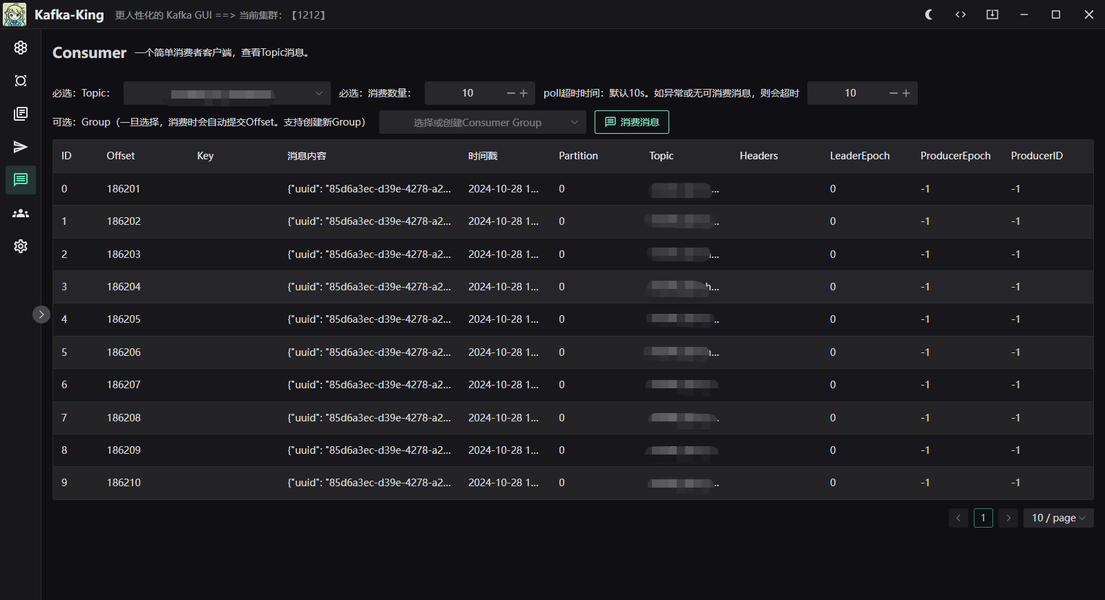 • Supports consumer clients, consumes the specified topic, size, and timeout according to the specified group, and displays the message information in various dimensions in a table